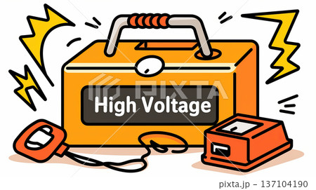 High voltage battery illustration with bold orange color, lightning bolts, and connected devices, emphasizing energy and power
