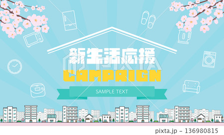 春季新生生活支援活動廣告背景範本(藍色),飾以櫻花和家用電器圖標