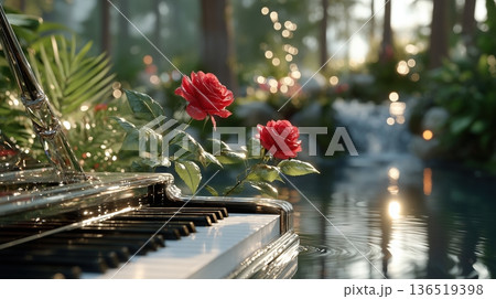 Sunlight illuminates a beautiful grand piano surrounded by dew-kissed red roses in a lush forest