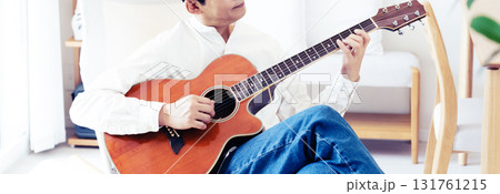 Close up of man playing an acoustic guitar while sitting on a sofa at home