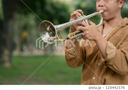Young man playing trumpet in a park, enjoying music in a peaceful outdoor