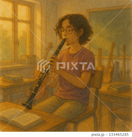 《午後的單簧管練習》— 手繪水彩風的靜謐音樂教室