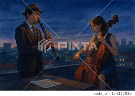 屋頂夜景的二重奏 水彩風男女演奏單簧管與大提琴