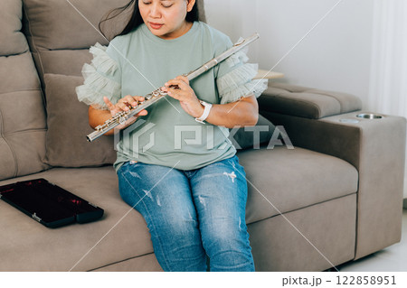 A female flutist in a green shirt sits gracefully on gray sofa, playing a silver flute. The cozy living room setting adds warmth and serenity, showcasing her passion for music in a casual environment.