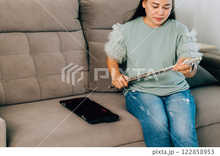 在客廳吹長笛的女人