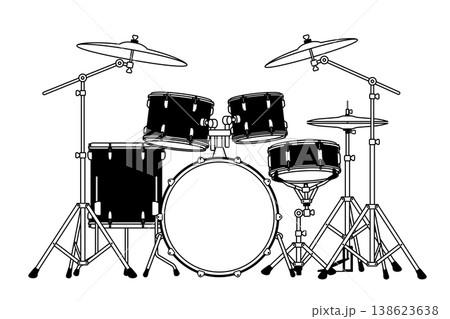Line art illustration of drum kit with drumsticks, music band instrument drawing