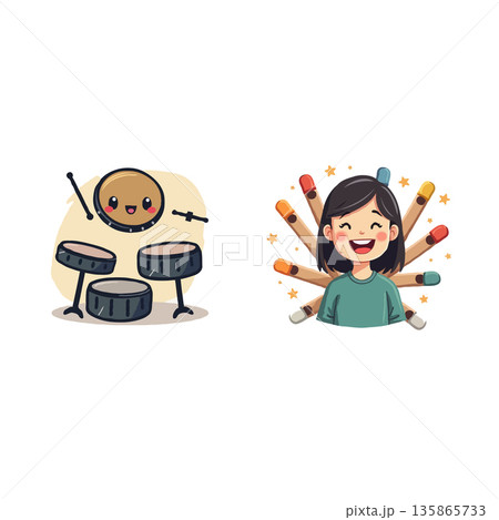 Cute cartoon illustration of a girl playing drums with multiple drumsticks and a smiling drum set.