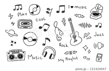 Hand drawn music elements in doodles style, guitar, music note, headphone, music discs