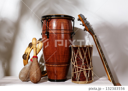 Composition of musical ethnic instrument. Maracas, tambourine, conga and ethnic drum. Percussion rhytm instruments