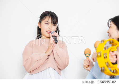 小學生女孩正在享受卡拉OK,她的父母在一旁為她加油。