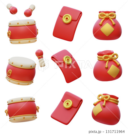 Chinese new year Drum, money envelope, lucky bag 3D Icon