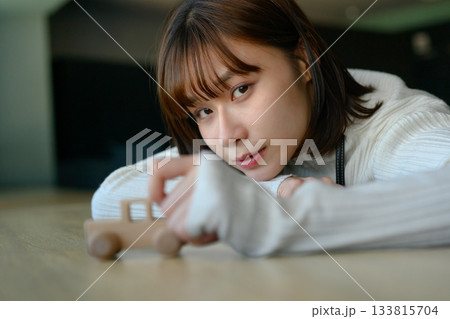 一位年輕女子正在玩木製玩具車的特寫肖像