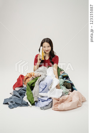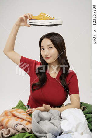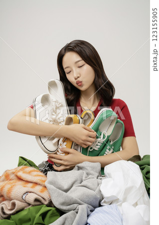 A woman in her 20s holding her shoes buried in a mountain of clothes.