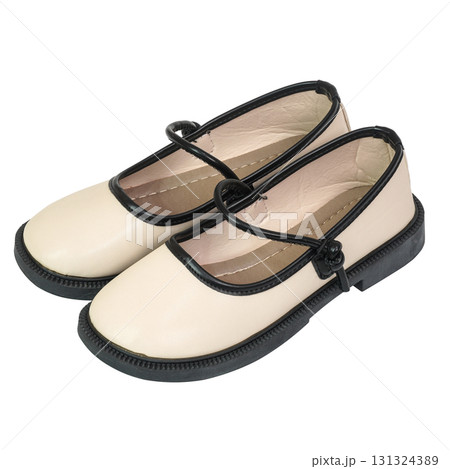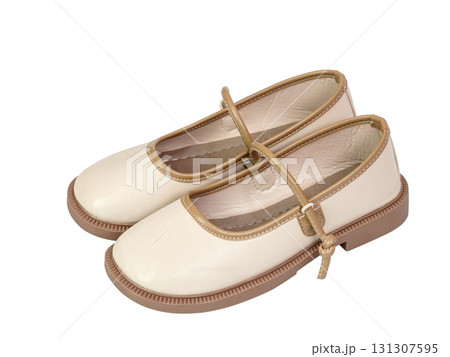 Cream shoes with brown trim and strap featuring classic round toe and sturdy sole isolated on white background