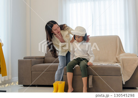 Woman helps a child with winter gear, putting on bright yellow waterproof boots as the kid sits on a sofa, wearing a fluffy hat and earmuffs getting ready for the cold winter day.