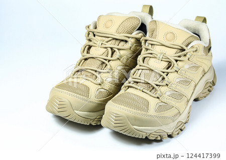 Pair of tactical or hiking shoes, waterproof winter trekking shoe isolate on white background.