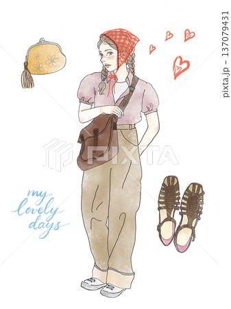 戴著墨鏡、手拿包的女人的時尚插圖(寬褲、涼鞋、休閒服)