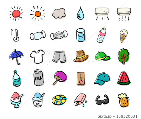 與夏天相關的塗鴉和插圖,例如太陽和刨冰。