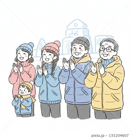 五位戴著圍巾和針織帽的男女合照。上半身插圖集。