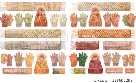 一系列保暖的冬季服裝(以白色顏料陰影效果呈現)| 圍巾、手套、外套、靴子、針織帽