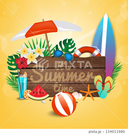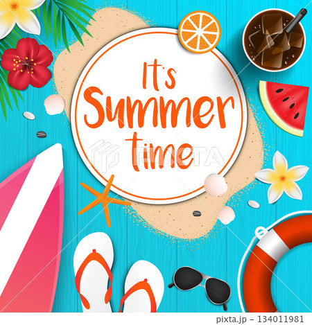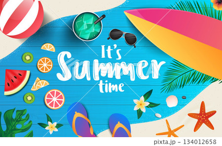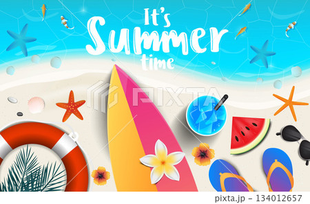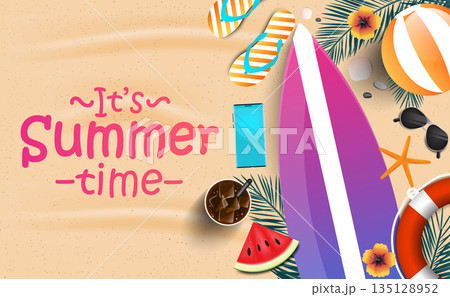 Summer Beach Beach Beach Sand Beach Background Illustration with Surfboard Beach Ball Tube Parasol Mat seen from above