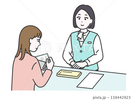 圖中描繪了一名女病人正在醫院接待處用現金支付費用,以及一名醫療辦公室工作人員。