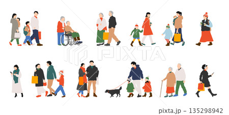 一組購物插畫,描繪了身著冬裝的男士、女士、家庭和老年人。