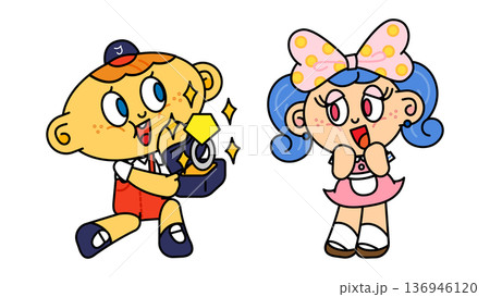 一幅流行人物插畫,描繪了一個男孩將一枚裝在盒子裡的大戒指送給一個被感動的女孩。