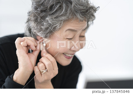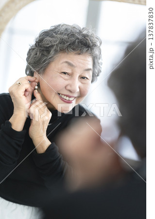 一位面帶微笑的老婦人對著鏡子戴耳環。