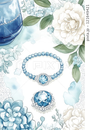 木製首飾盒插畫 手鐲與珍珠吊墜 簡約自然水彩場景