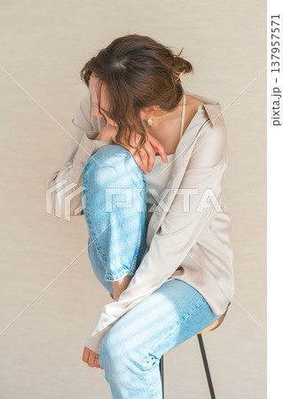 一位時尚女性抱著膝蓋低頭(模特,時尚攝影,美容)