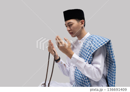 Focused man with rosary beads. Detailed image of man gripping rosary with thoughtful expression