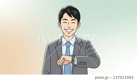 一位神態輕鬆的商務人士正在查看他的智慧手錶上的時間。