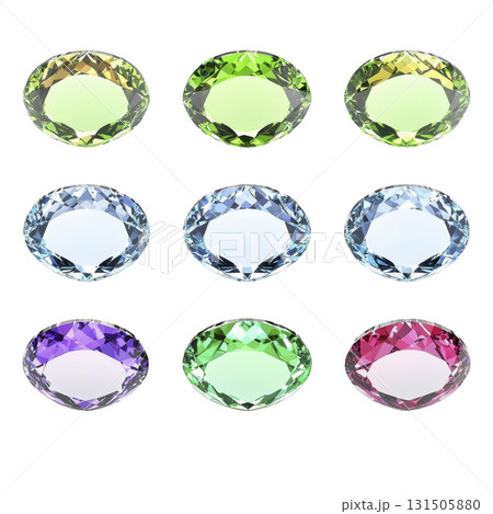 collection of nine colorful gemstones arranged in grid pattern, featuring shades of green, blue, purple, and pink, each with faceted cut that reflects light beautifully