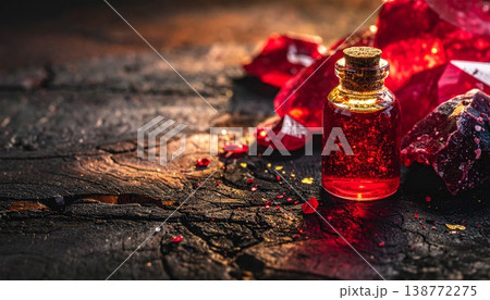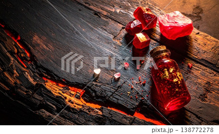 一瓶散發著奇異紅色光芒的液體,散落在一棵老樹上,樹上還散落著一些寶石。