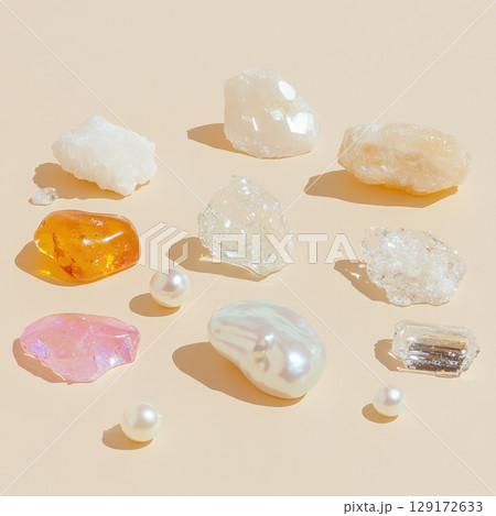 Colorful Arrangement of Various Unique Crystals and Pearls on Surface