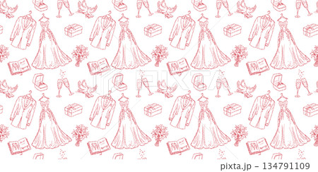 Elegant wedding ceremony seamless pattern with bridal gown and groom suit, romantic floral bouquet and champagne hand drawn doodle vector wallpaper
