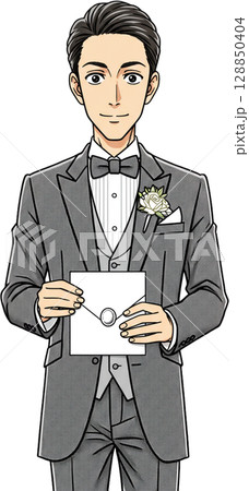 一位身穿西裝的年輕男子雙手放在身前站立的插圖