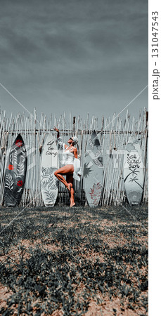 A woman poses artfully in a white shirt among a line of decorative surfboards.