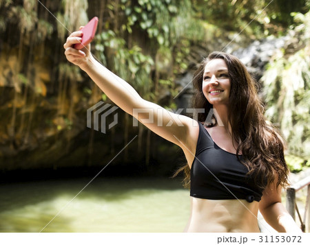 Caribbean Islands, Saint Lucia, woman taking selfie by waterfall