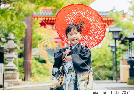 使用軀幹為孩子穿上七五三節的正式服裝 為 5 歲男孩穿上正式服裝