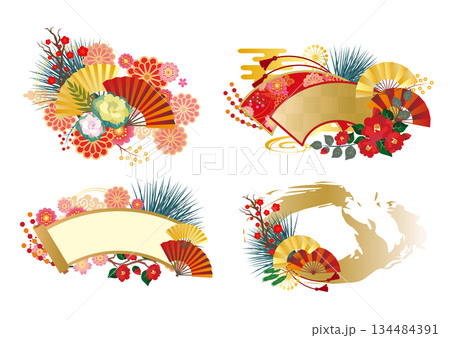 紅白菊花和金色扇子新年裝飾