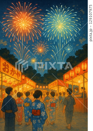 一家人穿著浴衣在夜晚的夏日祭典中漫步的插圖