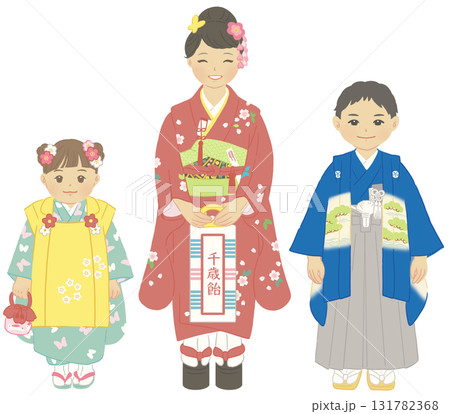 一幅色彩鮮豔的手繪插圖,描繪了一位身穿四件套和服的女孩、一位身穿羽織和袴的男孩,以及一位身穿秘府和服的小女孩