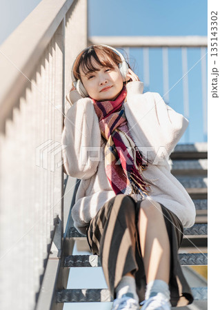 年輕女子坐在樓梯上,戴著耳機聽音樂。