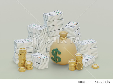 Stacked bundles of 100 US dollar banknotes in cartoon 3D style