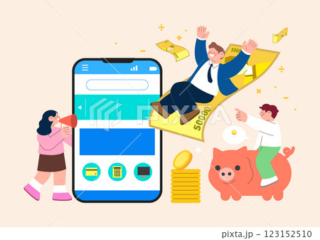People carrying money and piggy bank and person holding megaphone making announcement