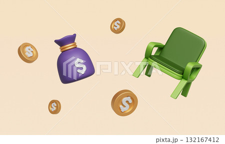 Retirement Saving Money Bag and Coins on Green Chair. 3D Rendering.