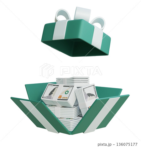3D cartoon gift box overflowing with bundles of money