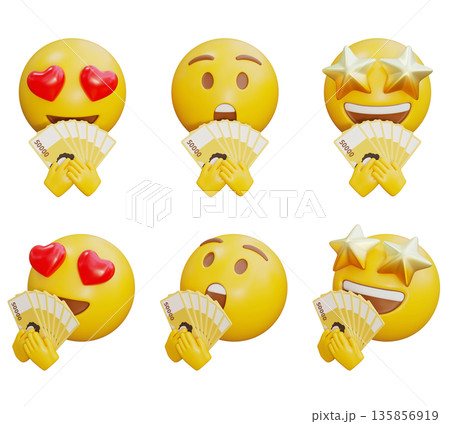 3D rendered emoji character holding paper money bills with both hands
